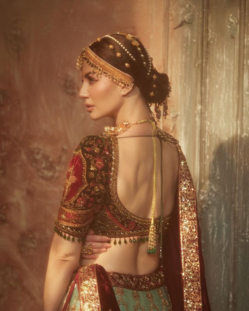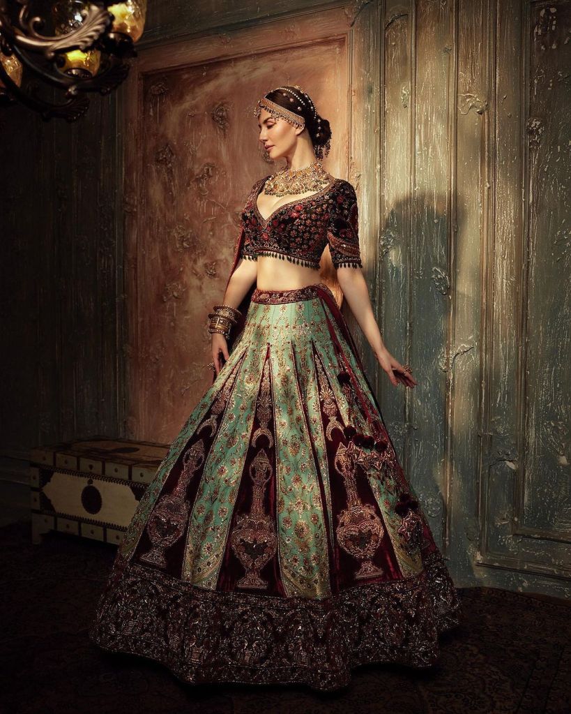 Giorgia donned a bridal lehenga from the exclusive collection of ace designer Lalit Dalmia. The bridal outfit donned by Giorgia Andriani was nothing less than a work of art. The lehenga, exquisitely embroidered in intricate patterns, featured shades of maroon and red that gracefully complemented her beauty. The green strap embellishments on the ghagra provided a striking contrast and added an element of vibrancy to the ensemble. The blouse was a masterpiece in itself, designed to accentuate her figure with a delicate embroidery plunging neckline that was a perfect fit for the actress.