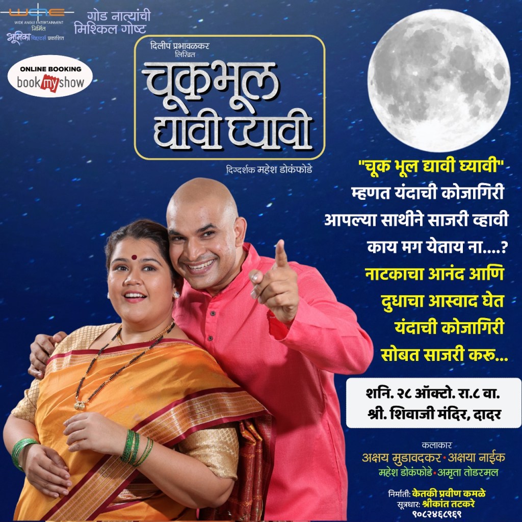 वाईड अँगल एंटरटेनमेंट निर्मित (केतकी प्रवीण कमळे) व भूमिका थिएटर प्रकाशित , दिलीप प्रभावळकर लिखित”चुकभूल द्यावी घ्यावी” गोड नात्यांची मिश्किल गोष्ट .ह्या नाटकाचं दिग्दर्शन महेश डोकंफोडे यांनी केलं आहे. संदेश बेंद्रे यांनी नेपथ्य, अशोक पत्की यांनी संगीत, अक्षय मुडावदकर आणि अभिषेक करंगुटकर यांनी गीतलेखन, शीतल तळपदे यांनी प्रकाशयोजना, नेहा मुडावदकर यांनी वेशभूषा, संदीप नगरकर यांनी रंगभूषेची जबाबदारी निभावली आहे. तर अक्षय मुडावदकर, अक्षया नाईक यांच्यासह महेश डोकंफोडे, अमृता तोडरमल यांच्याही नाटकात भूमिका आहेत.