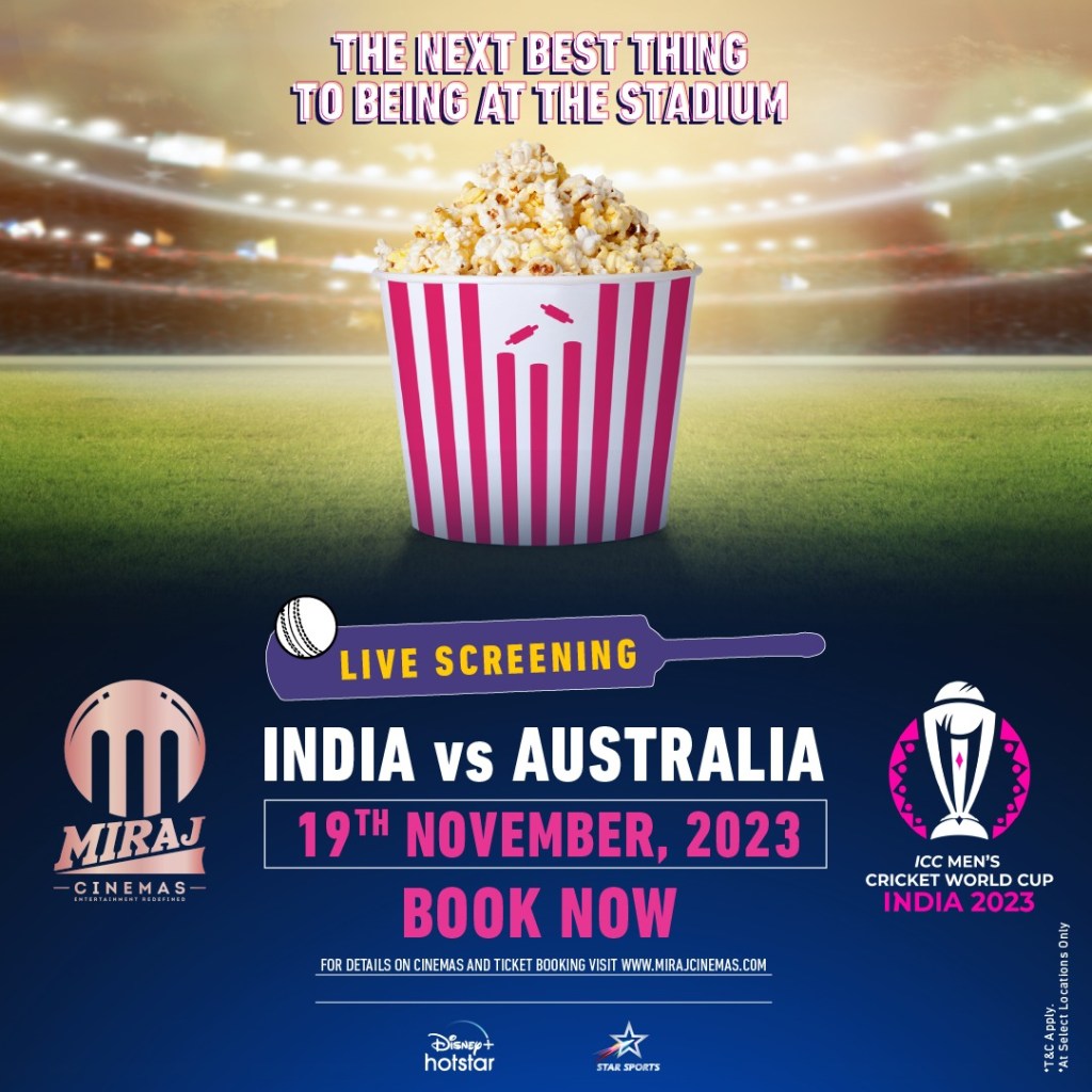 Miraj Cinemas, India’s third-largest and fastest-growing national multiplex chain, is delighted to announce the overwhelming response to the advance ticket booking for the much-anticipated World Cup Final match between India and Australia, scheduled for 19th November at 12 PM onwards.