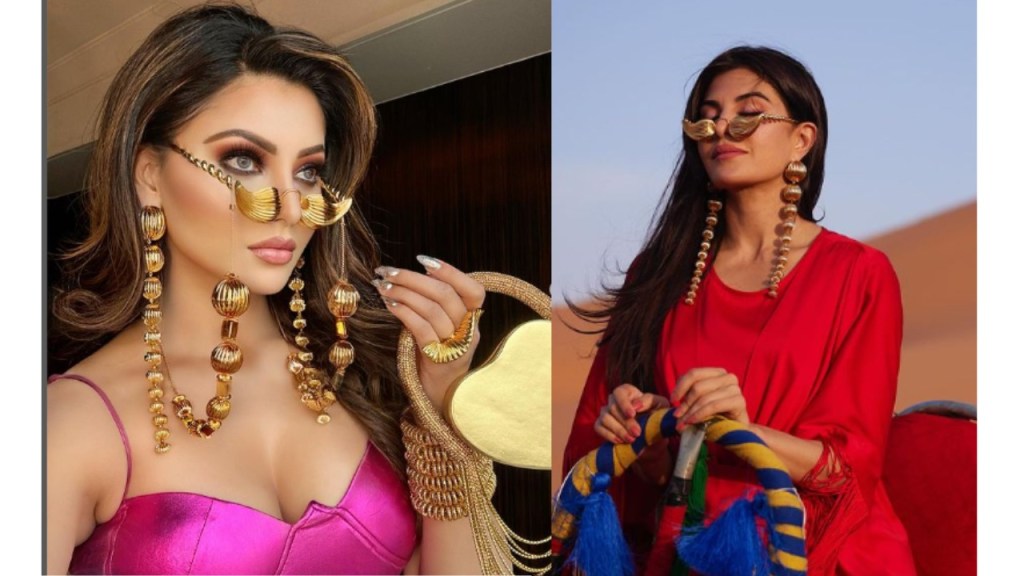 Actress Jacqueline Fernandez decided to take a cue from Urvashi’s style playbook, as the actress got inspired by Urvashi and wore the same exquisite jewelry from Amana Jewells just a week after Urvashi did. Jacqueline got inspired by Urvashi and copied her look which she has worn for her trip. Urvashi has last week uploaded a slew of pictures of herself in a Pink latex midi dress in which she paired her look with Amana Jewelry in which wore customized earrings, rings, bracelets, and even a bag and now Jacqueline copied Urvashi and wore from the same collection of Maxima the Shoulder duster earring and feather-shaped framed eyewear.