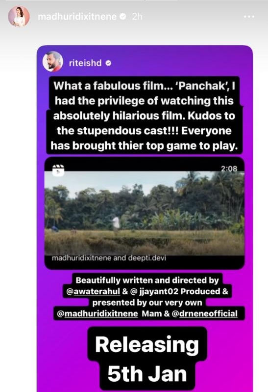 प्रेक्षकांकडून, इंडस्ट्रीतील सह कलाकारांकडून मिळणाऱ्या शुभेच्छांबद्दल माधुरी दीक्षित नेने म्हणतात, ” खूप छान वाटतेय, प्रेक्षकांना, इंडस्ट्रीतील माझ्या मित्र परिवाराला ‘पंचक’चा ट्रेलर आवडला. सगळ्यांचे मनापासून आभार. तुमचे प्रेम आमच्या टीमवर सदैव असेच असुदे. मला खात्री आहे माझा इंडस्ट्रीतील परिवार हा चित्रपट नक्की बघणार. प्रेक्षकांनाही ‘पंचक’ खूप आवडेल.”