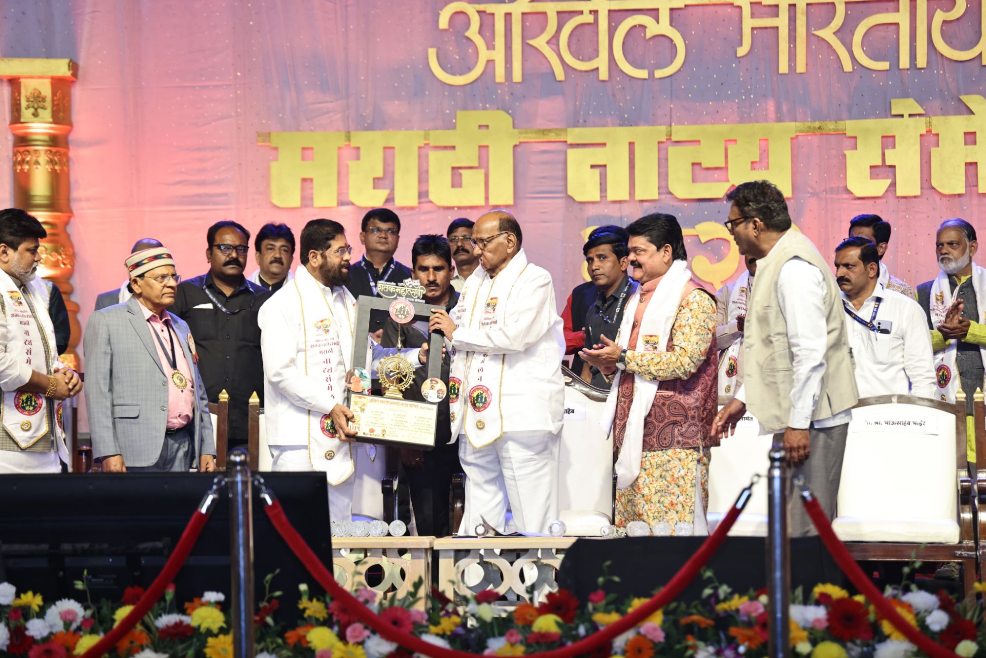 चिंचवड येथील आद्य नाटककार विष्णूदास भावे नगरीत सुरू झालेल्या शंभराव्या नाट्यसंमेलनाचे उद्घाटन ९९ व्या नाट्य संमेलनाचे अध्यक्ष प्रेमानंद गज्वी यांच्या उपस्थितीत नटराज, घंटेचे पूजन करून करण्यात आले. मुख्यमंत्री एकनाथ शिंदे, संमेलनाचे स्वागत अध्यक्ष शरद पवार, उद्योगमंत्री उदय सामंत, शंभराव्या संमेलनाचे अध्यक्ष डॉ.जब्बार पटेल, नाट्य परिषदेचे अध्यक्ष प्रशांत दामले आदि मान्यवर मंडळी याप्रसंगी उपस्थित होती. यावेळी बोलताना संमेलनाचे स्वागत अध्यक्ष शरद पवार यांनी “वृद्ध कलाकारांच्या मानधनात वाढ करावी, घरकुल योजना करावी, नाट्यगृहाच्या भाड्याबाबतीत विचार करावा, यांसाठी विशेष अनुदान देण्यात यावे असा प्रस्ताव मांडला.