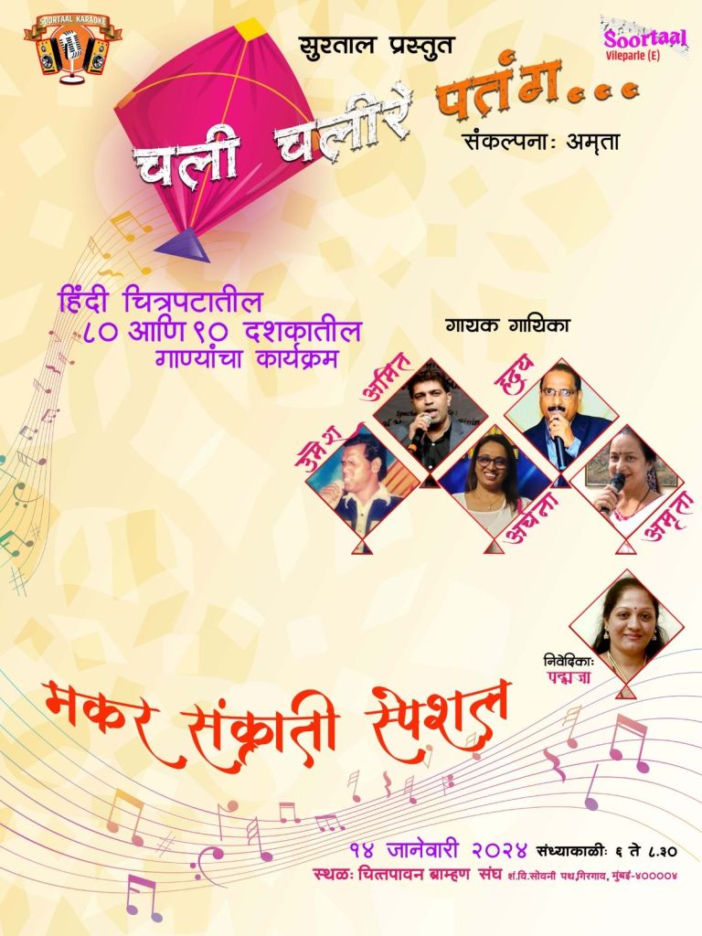 संगीत साधनेसोबतच आपल्या रूढी परंपरांचे जतन करून त्या नव्यापिढीकडे हस्तांतरित व्हाव्यात या दृष्टीने एक एक पाऊल पुढे जात सामाजिक भान जपणारी ‘सूर-ताल’ विलेपार्ले(पूर्व) ही संस्था विविध माध्यमातून अनेक उपक्रम राबवित असते. नुकतीच या संस्थेने जेष्ठ नागरिकांसोबत ‘शेतातील गाणे आणि स्वादिष्ठ खाणे’ या धर्तीवर हुर्डा पार्टी आयोजित करून एकल जेष्ठांमध्ये स्नेह वाढवला. येत्या मकरसंक्रांतीच्या निमित्ताने ‘सूर-तालने रविवार दिनांक १४ जानेवारी २०२४ रोजी ‘चली चली रे पतंग’ या संगीतमय कार्यक्रमाचे आयोजन केले आहे. गायक रुदय, अमित, उमेश, अर्चना आणि अमृता हे या कार्यक्रमात आपला स्वर मिसळणार असून प्रामुख्याने मकरसंक्रातीचे महत्व विशद करणाऱ्या लोकप्रिय गीतांतून हिंदू संस्कृतीचे दर्शन घडणार आहे. हिंदी – मराठी लोकप्रिय चित्रपट गीतांचा या कार्यक्रमात समावेश असणार आहे. आकाशवाणीच्या प्रसिध्द आरजे पद्मजा बापये या कार्यक्रमाचे रंजक आणि खुसखुशीत निवेदन करणार आहेत.