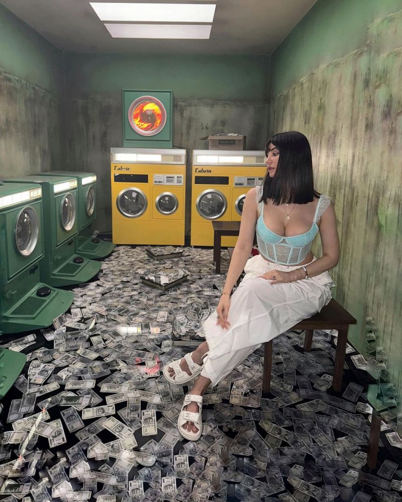 In the series of pictures, Giorgia is seen amidst intriguing settings, each exuding its artistic flair. One particularly striking image features her surrounded by a floor strewn with fake printed floor-designed money. Another portrays her seated on a bench, engrossed in a book, adding a touch of intellect and sophistication to the scene. Additionally, there’s an art installation resembling a fake railway compartment, adding a surreal dimension to the collection.