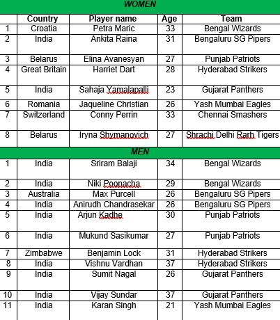गतविजेत्या बेंगळुरू एसजी पायपर्स संघाने दुसऱ्या क्रमांकाच्या महागड्या खेळाडूची खरेदी करताना दोन वेळचा ग्रॅण्ड स्लॅम मिश्र दुहेरी विजेता ऑस्ट्रेलियाचा मॅक्स पर्सेल याच्यासाठी ४२ लाख रुपये मोजले. रोहन गुप्ता यांच्या मालकीच्या व एसजी स्पोर्टसचा मुख्य अधिकारी महेश भूपती याचा पाठिंबा असलेल्या बेंगळुरू संघाने लिलावात उशिरा भाग घेतला. तरीही ऑलिम्पिक पटू अंकिता रैनाला ५लाख रुपयांत खरेदी करताना आपल्या संघाची ताकद वाढवली. त्यांनी दुहेरी स्पेशा लिस्ट अनिरुद्ध चंद्रशेखर याची सुद्धा ४ लाख रुपयाला खरेदी केली.