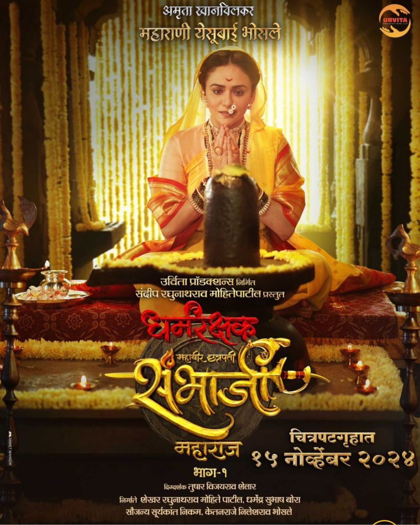 ठाकूर अनुप सिंग छत्रपती संभाजी महाराजांची प्रमुख भूमिका साकारणार असल्याचे पहिल्या पोस्टरने जाहीर झाले आणि आणखी कोणते कलाकार कोणती भूमिका साकारणार याची प्रेक्षकांना उत्सुकता लागली होती. आज घटस्थापनेच्या मुहूर्तावर प्रसिद्ध केलेल्या पोस्टरमुळे या चित्रपटात सुप्रसिद्ध अभिनेत्री अमृता खानविलकर ‘महाराणी येसूबाई भोसले’ ही व्यक्तिरेखा साकारणार असल्याचे स्पष्ट झाले आहे. शिव स्मरूनी, असुरा मर्दूनी, नटली असे शंभू अस्तुरी, पिवळा मळवट, भगवी धरणी, सह्याद्रीची शैलपुत्री! अशा ओळी असलेल्या पोस्टर मध्ये अमृता पिवळी साडी, मराठमोळा साजशृंगार करून हात जोडून शिवलिंगाकडे भक्तिभावाने बघताना दिसते आहे. ‘धर्मरक्षक महावीर छत्रपती संभाजी महाराज’ या चित्रपटाच्या निमित्ताने ती या महत्त्वाच्या ऐतिहासिक भूमिकेत प्रेक्षकांसमोर येणार आहे. आपल्या अभिनयाने अनेक भूमिका संस्मरणीय करणाऱ्या अमृताला ‘महाराणी येसूबाई भोसले’ या भूमिकेत बघणं ही प्रेक्षकांसाठी एक पर्वणीच आहे.