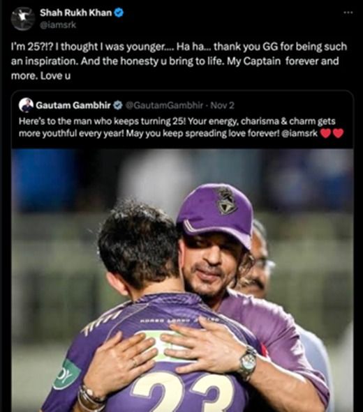 Shah Rukh Khan responded in his typical charming manner, jokingly questioning his age while honouring Gambhir as an inspiration and his “Captain forever.” He said: