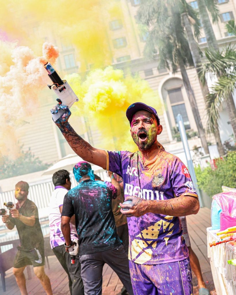 Amidst bursts of gulal and cheer, KKR stars including Ajinkya Rahane, Venkatesh Iyer, Rinku Singh, and Angkrish Raghuvanshi were seen enthusiastically participating in the celebrations, smearing colours on each other and posing for cheerful photographs.