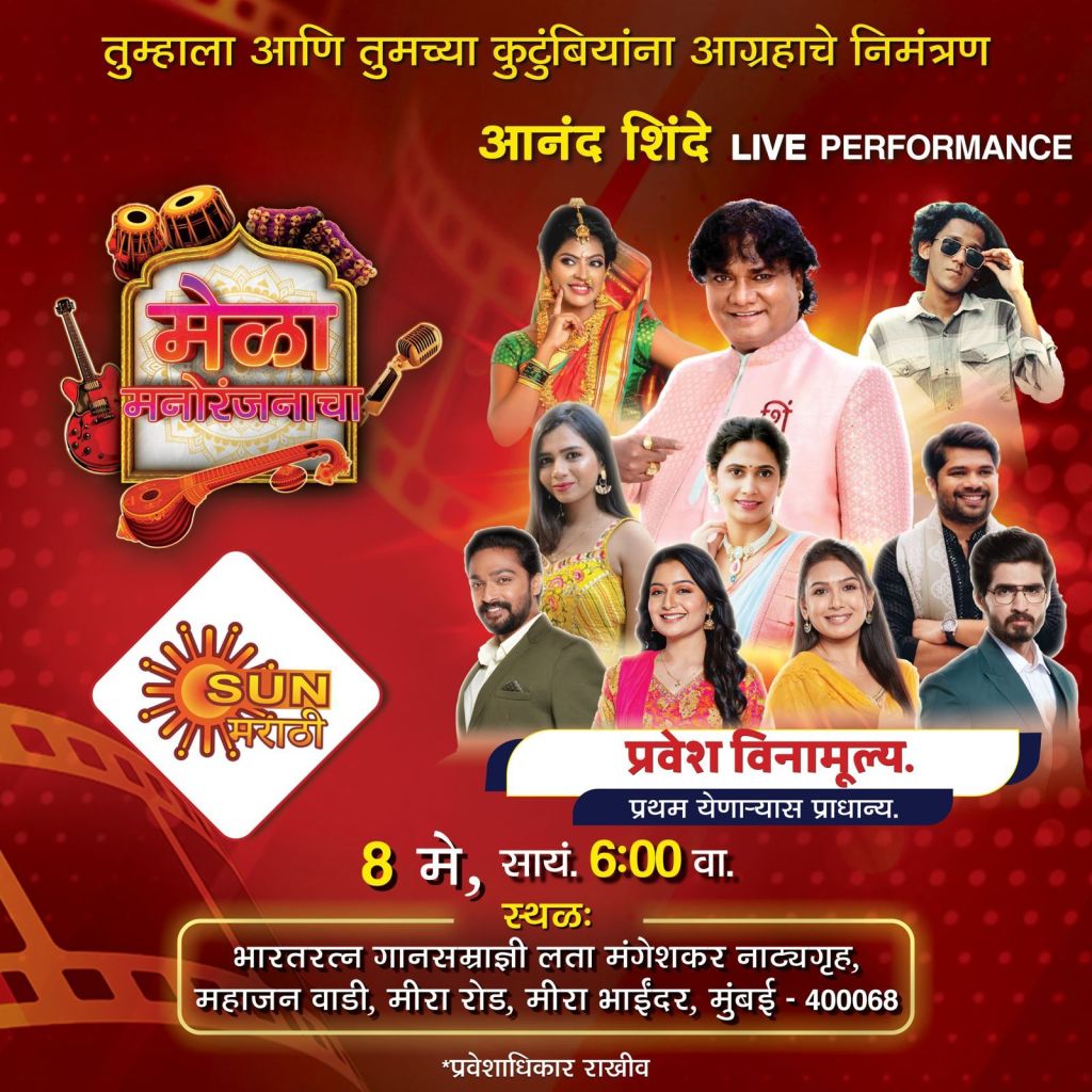 सन मराठी प्रस्तुत ‘मेळा मनोरंजनाचा’ हा धमाल कार्यक्रम ८ मे २०२५ रोजी सायंकाळी ६ वाजता भारतरत्न गानसम्राज्ञी लता मंगेशकर नाट्यगृह, मिरा रोड पूर्व, ठाणे येथे पार पडणार आहे. या कार्यक्रमातून ‘सन मराठी’ प्रेक्षकांसाठी मनोरंजनाची पर्वणी घेऊन येत आहे.