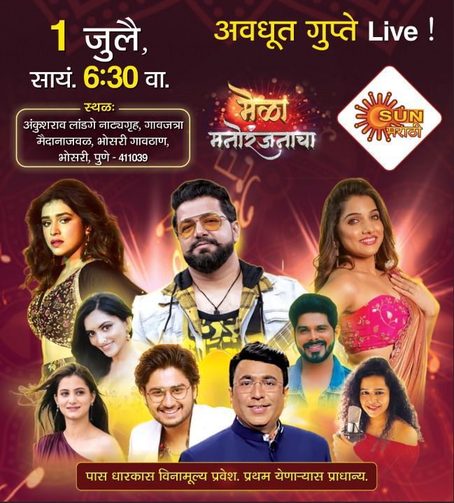 पिंपरी चिंचवडमध्ये जुलै महिन्याची सुरुवात दणक्यात होणार असून, सन मराठी प्रस्तुत ‘मेळा मनोरंजनाचा’ हा भव्य कार्यक्रम १ जुलै २०२५ रोजी सायंकाळी ६ वाजता अंकुशराव लांडगे नाट्यगृह, भोसरी येथे रंगणार आहे. महाराष्ट्राचा रॉकस्टार अवधूत गुप्ते, अभिनय क्षेत्रातील गुणी कलाकार पुष्कर श्रोत्री, संस्कृती बालगुडे, अभिनय बेर्डे, जान्हवी किल्लेकर यांच्यासह अनेक दिग्गज कलाकारांचे धमाकेदार परफॉर्मन्स पाहायला मिळणार आहेत.