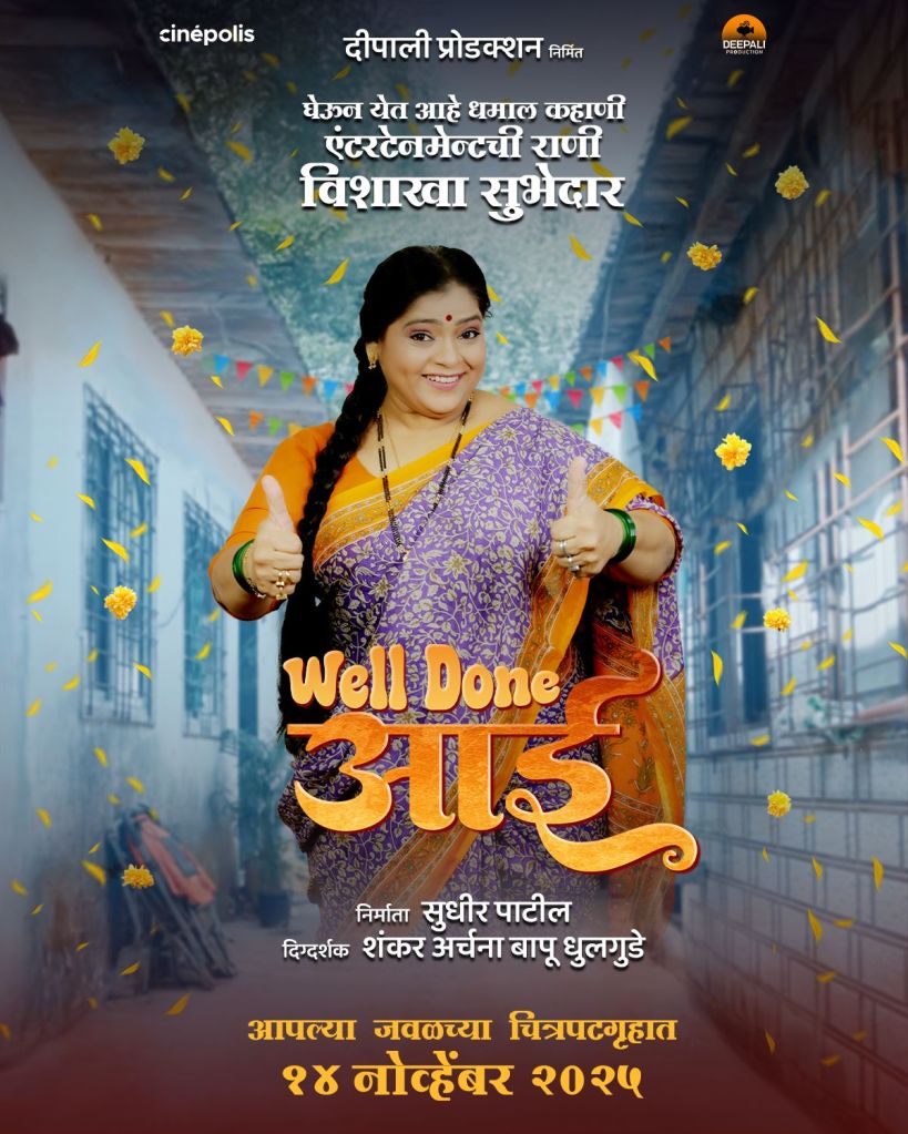 दीपाली प्रोडक्शन प्रस्तुत ‘वेल डन आई’ या चित्रपटाचे मोशन पोस्टर नुकतेच प्रदर्शित करण्यात आले. चित्रपट १४ नोव्हेंबर रोजी राज्यभरात प्रदर्शित होणार असून, पोस्टरमध्ये चाळीच्या पार्श्वभूमीवर थम्प-अप करणारी आईच्या रूपातील विशाखा सुभेदार लक्ष वेधून घेतात. ‘वेल डन आई’ या शीर्षक गीतासह हे पोस्टर सोशल मीडियावर चर्चेत आले आहे.