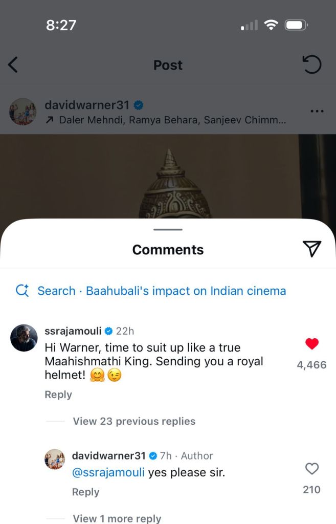 या फोटोंवर स्वत: दिग्दर्शक एस. एस. राजामौली यांनी लक्ष दिलं आणि ते रीपोस्ट करत लिहिलं – “हाय वॉर्नर, आता खऱ्या माहिष्मतीच्या राजासारखा तयार हो. तुझ्यासाठी एक शाही हेल्मेट पाठवत आहे!” त्यावर वॉर्नरनेही उत्तर देत लिहिलं – “हो सर, नक्कीच!” या मजेशीर संवादाने दोघांचे चाहते खुश झाले.