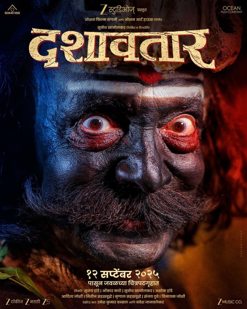 ‘झी स्टुडिओज’ प्रस्तुत आणि ओशन फिल्म कंपनी व ओशन आर्ट हाऊस निर्मित ‘दशावतार’ या आगामी मराठी चित्रपटाचं पोस्टर नुकतंच सोशल मीडियावर झळकलं असून, प्रेक्षकांच्या मनात याने प्रचंड उत्सुकता निर्माण केली आहे. काळसर रंगछटा, रौद्र चेहरा, लालसर डोळे आणि तीव्र कटाक्ष असलेला चेहरा या पोस्टरमधून दिसतोय आणि नेमकं काय घडणार आहे याचा अंदाज लागत नाही.