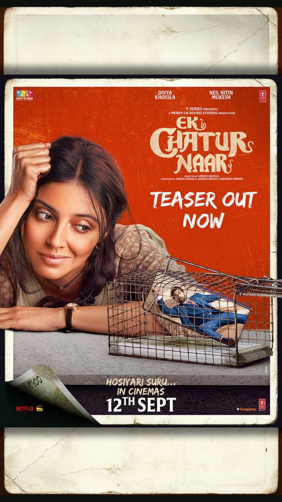 Ek Chatur Naar is presented by T-Series and produced by Umesh Shukla, Ashish Wagh, and Zeeshan Ahmad under the Merry Go Round Studios banner. Directed by Umesh Shukla, the film stars Divya Khossla and Neil Nitin Mukesh in lead roles. The comedy thriller is all set to release in cinemas on 12th September 2025.
