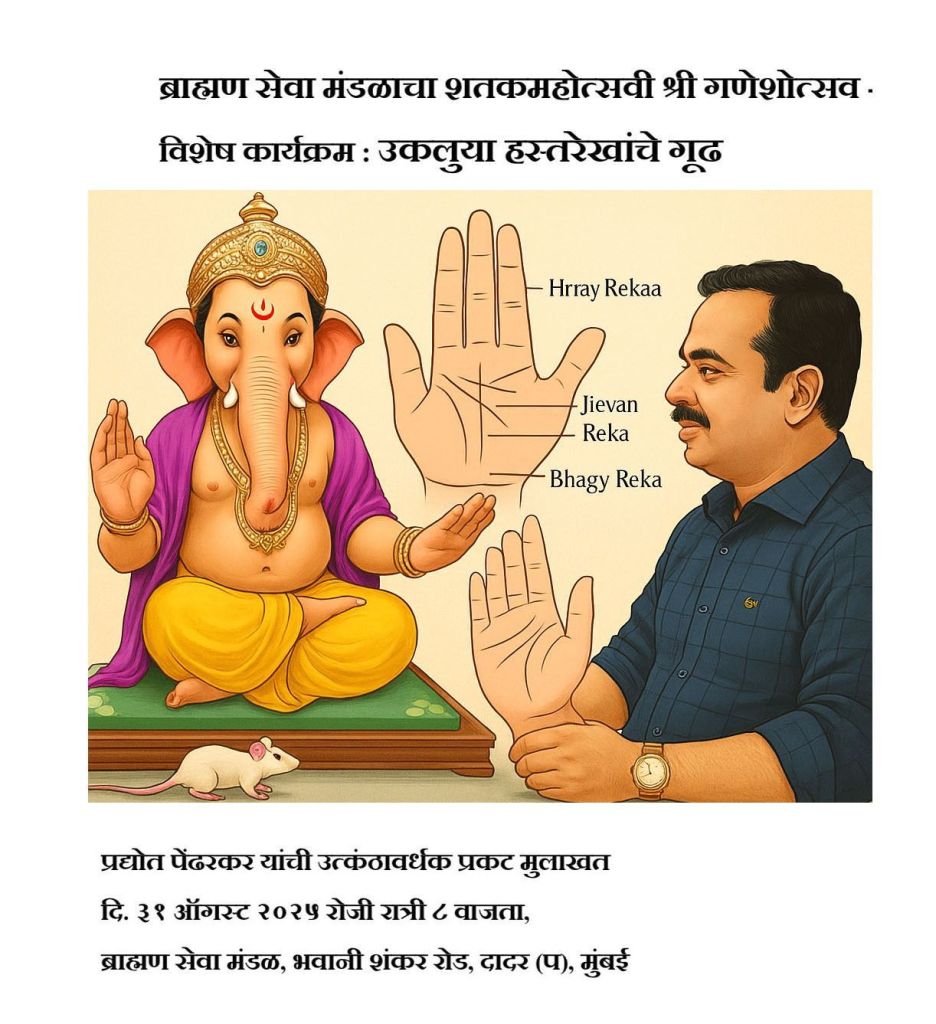 ‘ब्राह्मण सेवा मंडळा’चा शतकमहोत्सवी श्री गणेशोत्सव २०२५ विविध उपक्रमांनी साजरा होत आहे. भक्तिभाव आणि मनोरंजनासोबत सामाजिक आणि सांस्कृतिक जाणीव जपणाऱ्या या सोहळ्यात आता ‘उकलुया हस्तरेखांचे गूढ’ हा विशेष कार्यक्रम होणार आहे. या कार्यक्रमातून गणेशभक्तांना हस्तरेषांचे गूढ उलगडण्याची अनोखी संधी मिळणार आहे.