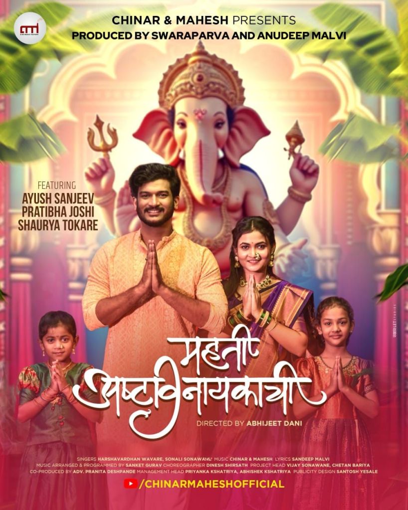 ‘महती अष्टविनायकाची’ हे गीत चिनार-महेश ऑफिशियल युट्युब चॅनेलवर प्रदर्शित झालं असून, सी एन एम म्युझिक फॅक्टरी लेबलखाली सादर करण्यात आलं आहे. हे गाणं तमाम गणेशभक्तांना भारावून टाकेल, असा विश्वास स्वरपर्वचे अनुदीप माळवी आणि संगीतकार चिनार-महेश यांनी व्यक्त केला आहे.