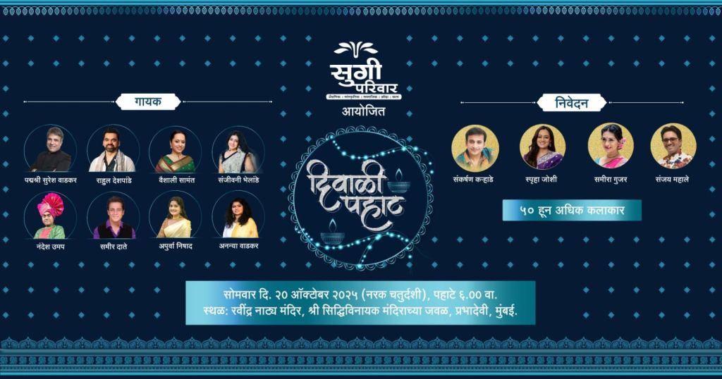 मुंबई, १० ऑक्टोबर २०२५: सुगी ग्रुप तर्फे दरवर्षी आयोजित केला जाणारा अत्यंत प्रतीक्षित सांस्कृतिक सोहळा ‘दिवाळी पहाट’ यंदाही मोठ्या उत्साहात पार पडणार आहे. दिवाळी उत्सवाच्या प्रारंभी दरवर्षी प्रमाणे पहाटेच्या मंगल सुरांनी उजळलेली ही परंपरा केवळ एक संगीत कार्यक्रम नसून महाराष्ट्राच्या समृद्ध संगीत वारशाचा आणि दिवाळीच्या आनंदाचा एकत्रित उत्सव आहे.