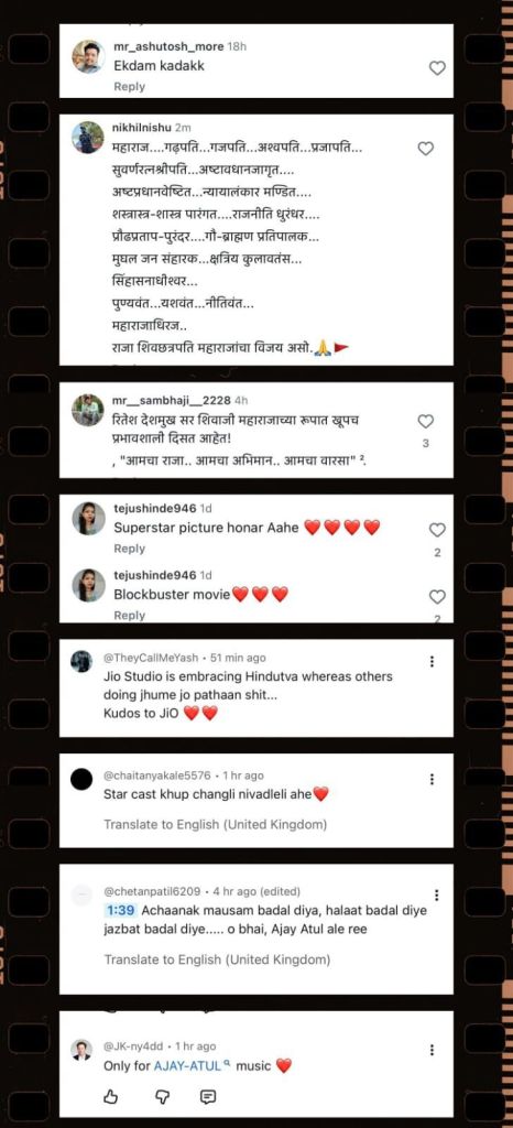 सोशल मीडियावर चाहत्यांकडून येणाऱ्या प्रतिक्रिया या चित्रपटाभोवती निर्माण झालेल्या प्रचंड उत्सुकतेचं स्पष्ट चित्र दाखवतात. अनेकांनी “परिपूर्ण सिनेमा”, “अंगावर रोमांच उभे राहिले” अशा प्रतिक्रिया देत चित्रपटाबद्दलचा आपला उत्साह व्यक्त केला आहे. काही चाहत्यांनी रितेश देशमुख यांच्या दिग्दर्शन आणि अभिनयाचं विशेष कौतुक केलं असून, इतिहास पुन्हा नव्याने अनुभवण्याची तयारी दर्शवली आहे.